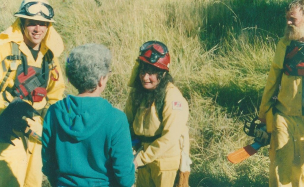 I could say about all the Chiefs, the people that stand up in their departments to be Chiefs, that it’s such a learning experience. It’s a learning curve because you learn skills about leadership, about training, about taking responsibility, about being clear with directions. There are so many aspects to being a Chief – and to everybody on the department for that matter. And I never felt that I was a Chief even when I sort of was, but I didn’t like, I didn’t feel comfortable to call myself a Chief. Because for one thing I don’t have a voice that’s commanding, and I don’t know if you have to – but I was in a situation where somebody, who was sort of not balanced mentally, went nuts just doing their own thing on a call – and I was yelling at him: “Do not cut that tree!”, because he was going to cut a tree onto an arcing line. And I could just see those chain of events, and he wouldn’t listen to me. And so I got megaphones after that thinking maybe this will make a difference I can really . . . but I just realized it’s